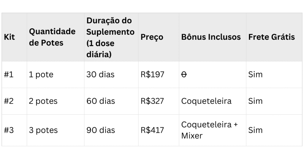 #3 Kit 3 Potes (MAIS RECOMENDADO): Aqui o preço por pote cai cerca de 30%. Além do desconto, você ganha 2 bônus: coqueteleira + mixer.